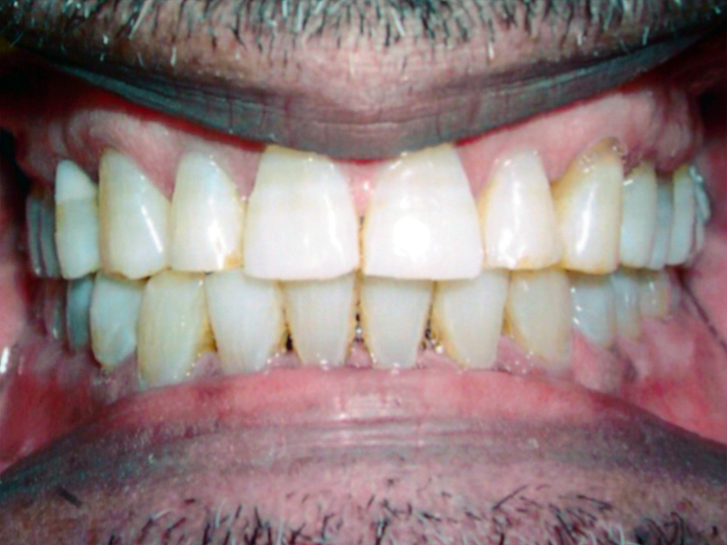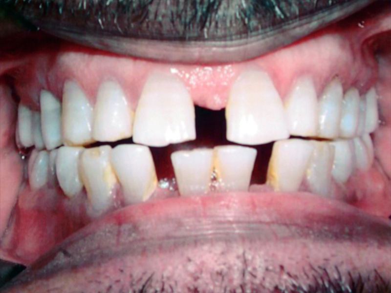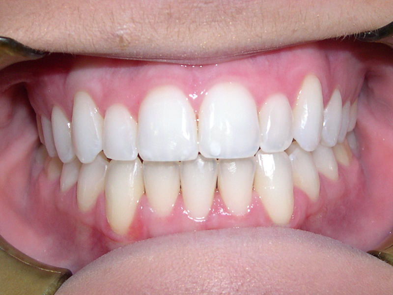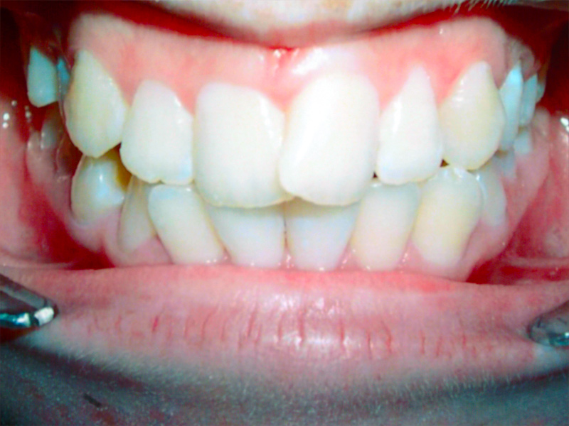 Adult presented with a strong tendency for a protruding lower jaw, bite was end to end, spaces on the upper and lower and teeth flared forward.