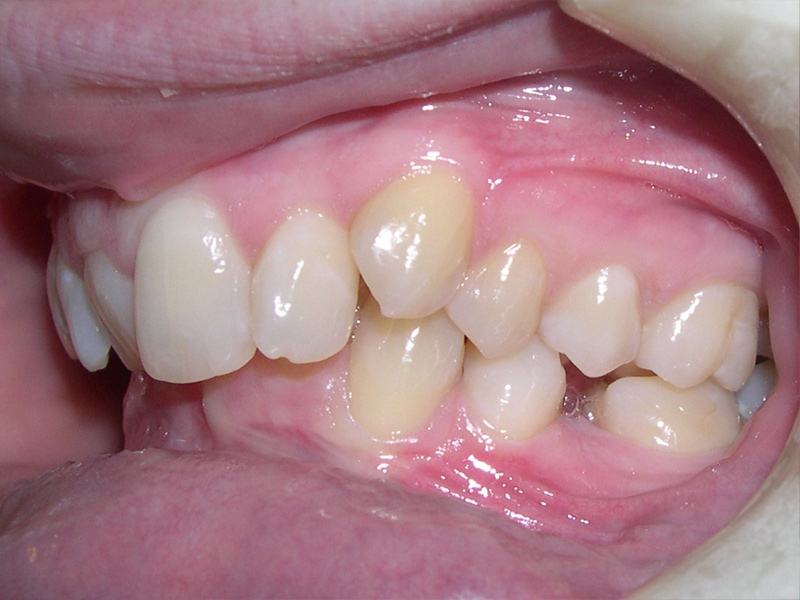 Adult with moderate to severe deep bite, retruded lower jaw, retroclined upper front teeth and crowding. Surgery was done to bring the lower jaw forward.